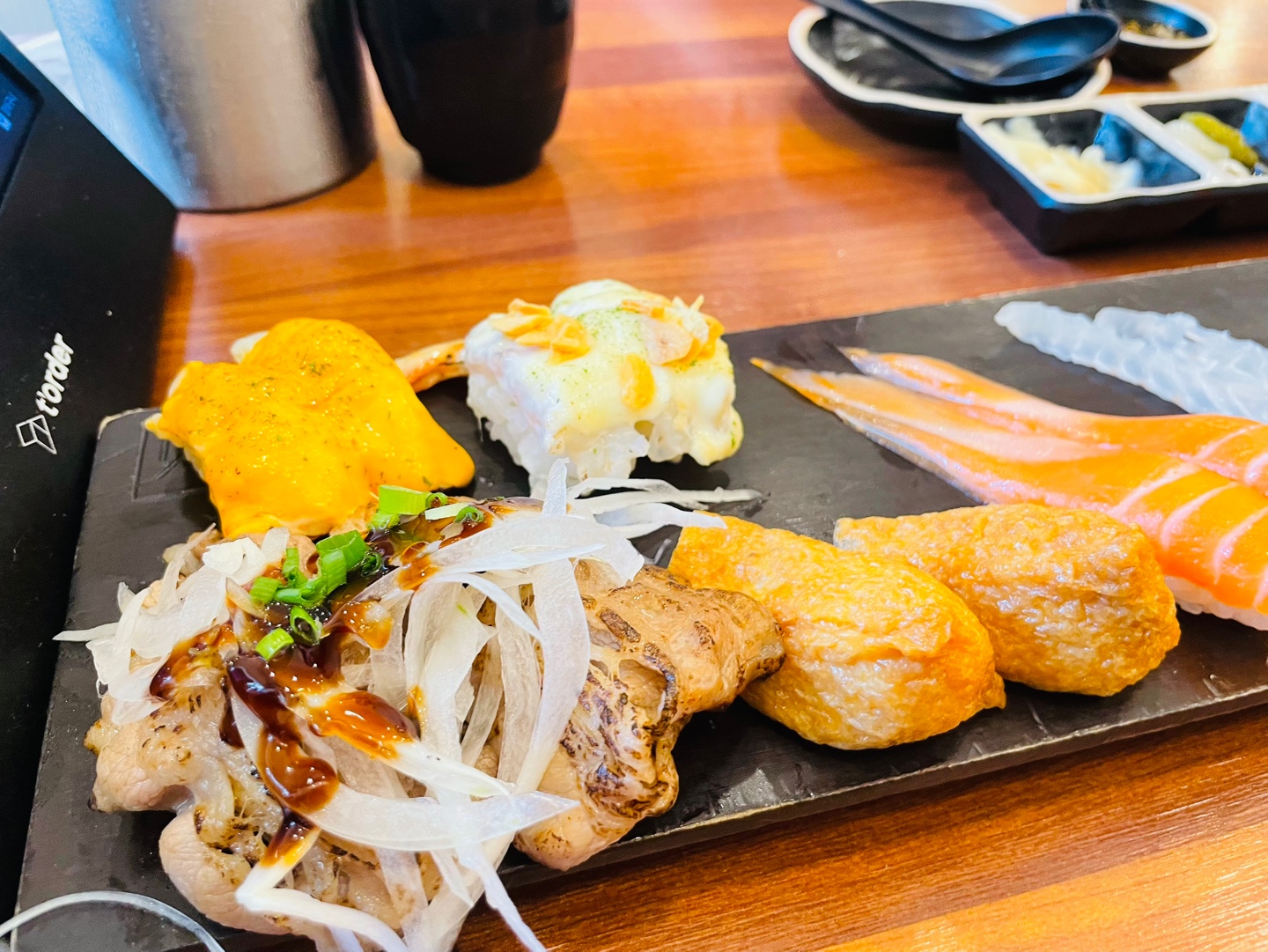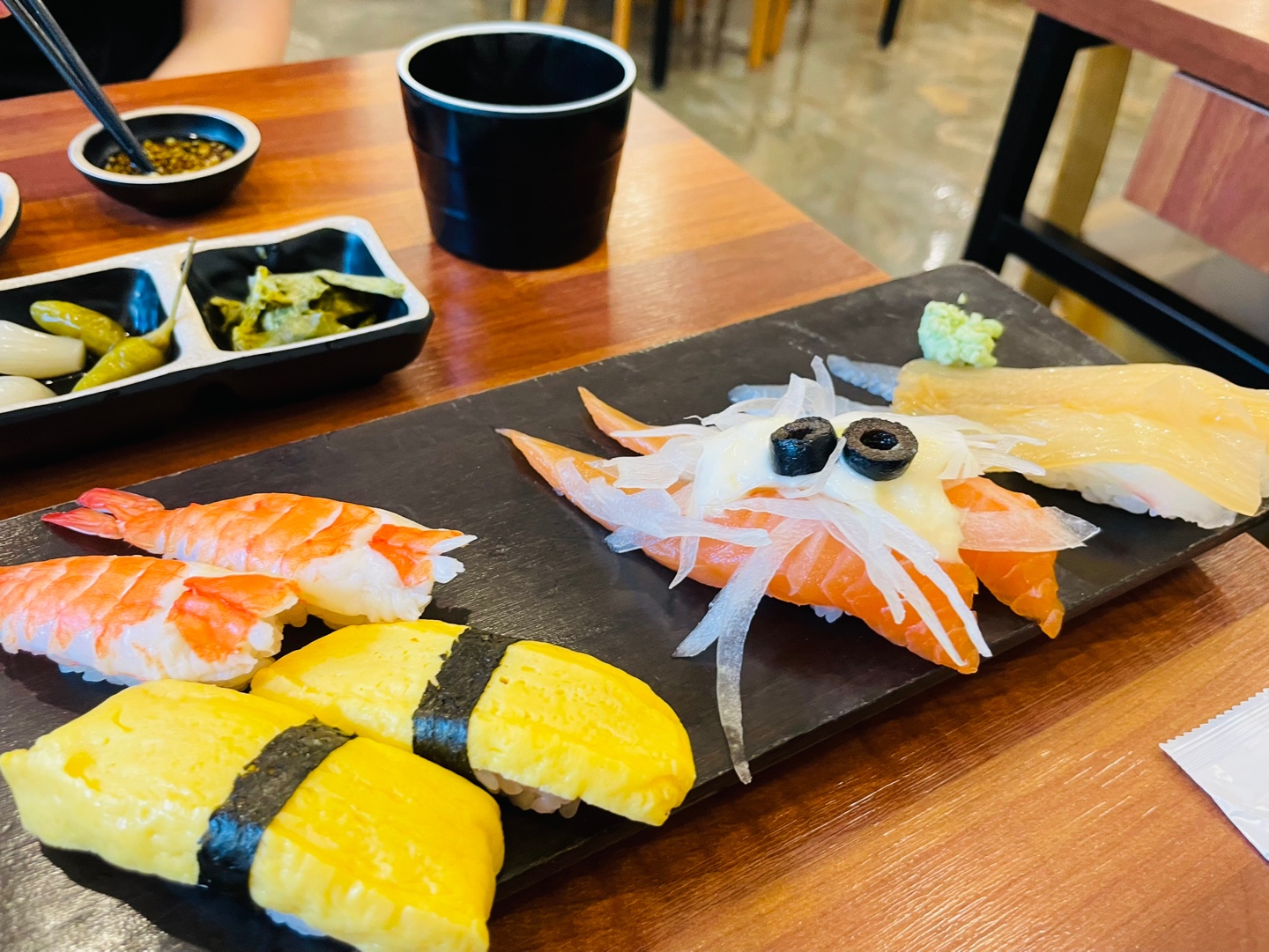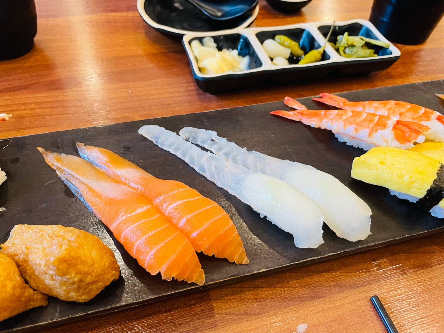 잠시 후, 긴 플레이트에 담긴 초밥이 테이블 위에 올려졌다.