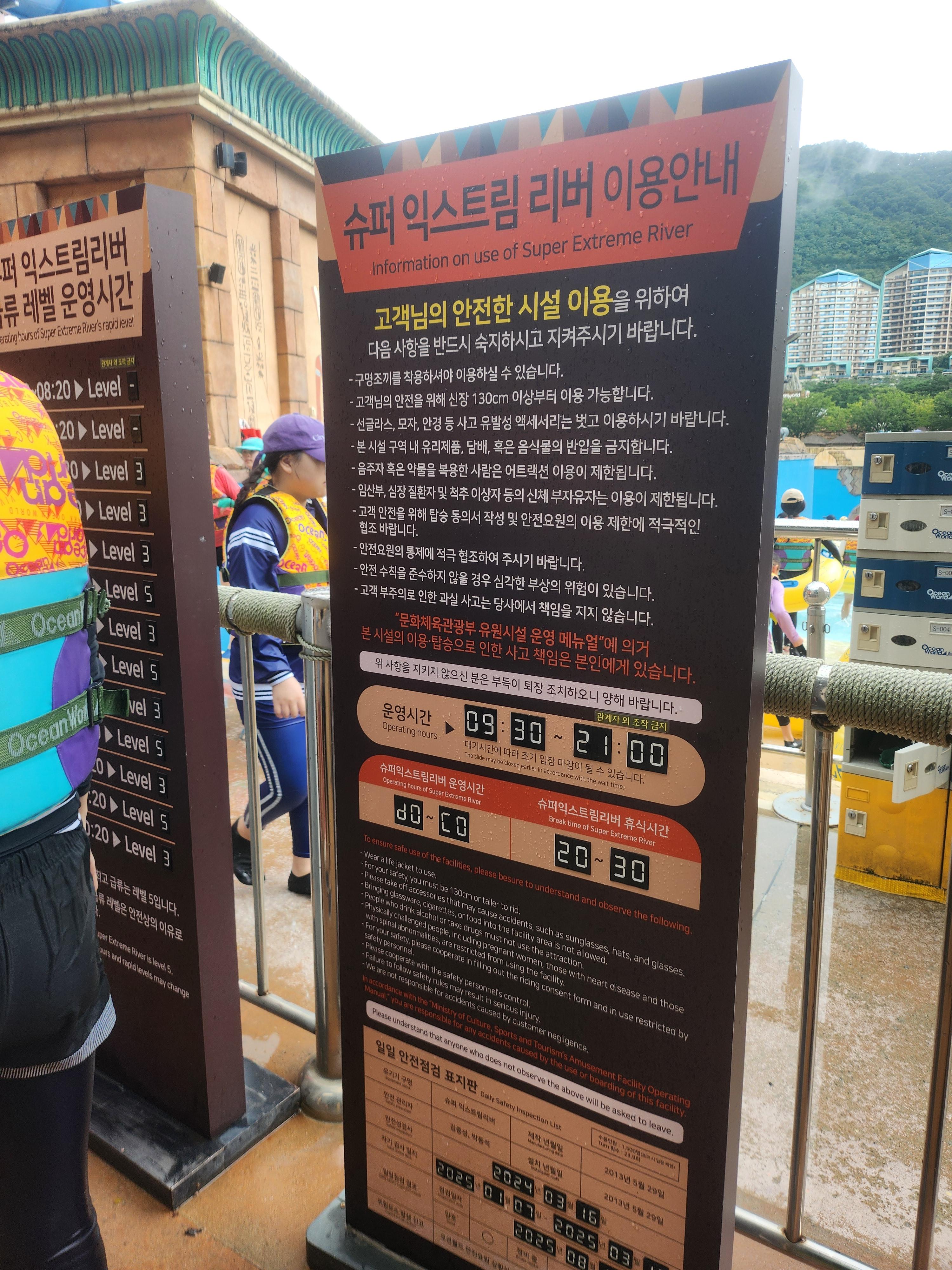 팁: 인기 기구는 오전에 먼저 타는 게 좋습니다. 슈퍼 익스트림 리버는 반드시 **Level 5 시간대(13:30 이후)**를 맞춰 타세요.